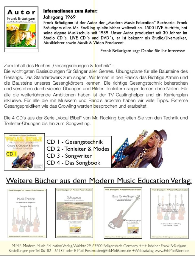Das Buch kommt ohne Noten daher und vermittelt den technischen Standpunkt für den Sänger und solche die es werden wollen. Die CD´s „Vocal Bibel“ vermittelrn als Technisches Standardwerk die notwendigen Schritte um dem Erfolg näher zu kommen.